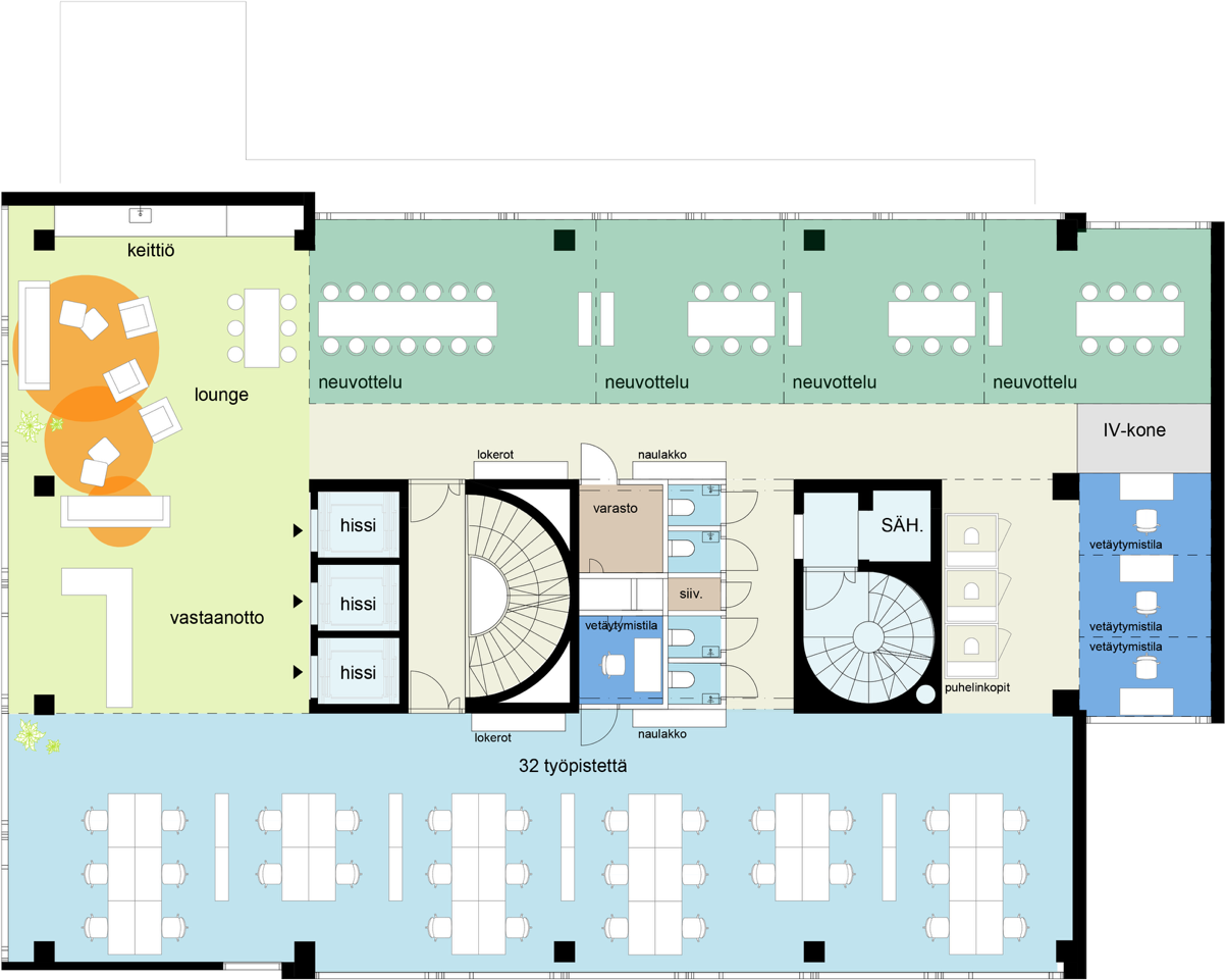 Yksittäinen kerros: 414 m² – jaettavissa kahdeksi n. 200 m² tilaksi