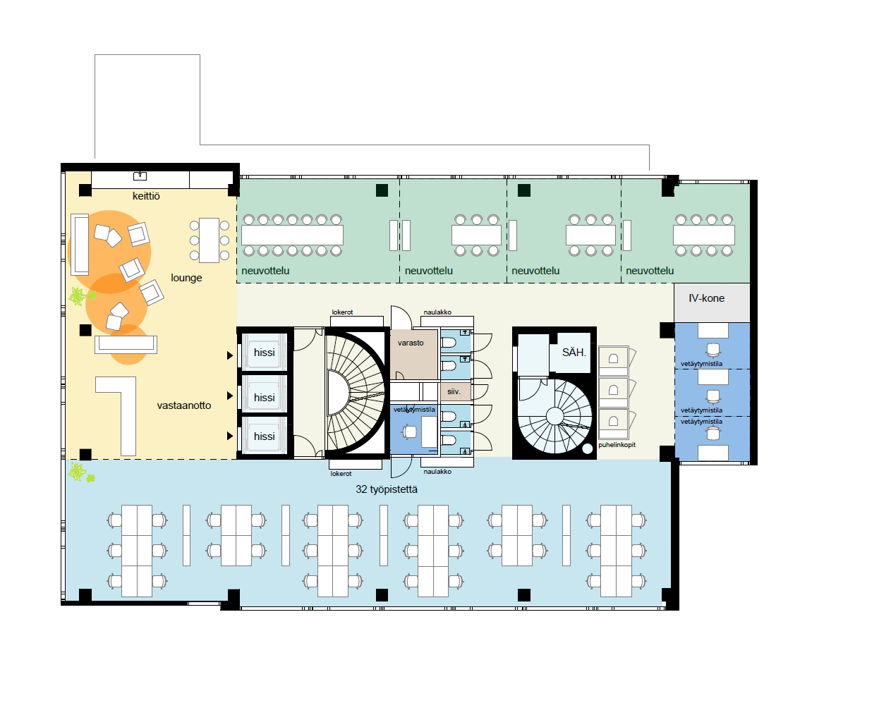 Tiloissa on huomioitu nykyaikaisen työn monimuotoisuus: tilat mahdollistavat sekä keskittymisen että vuorovaikutuksen. Myös hybridityö ja muuntojoustavuus ovat hankkeen keskeisiä suunnitteluperiaatteita.